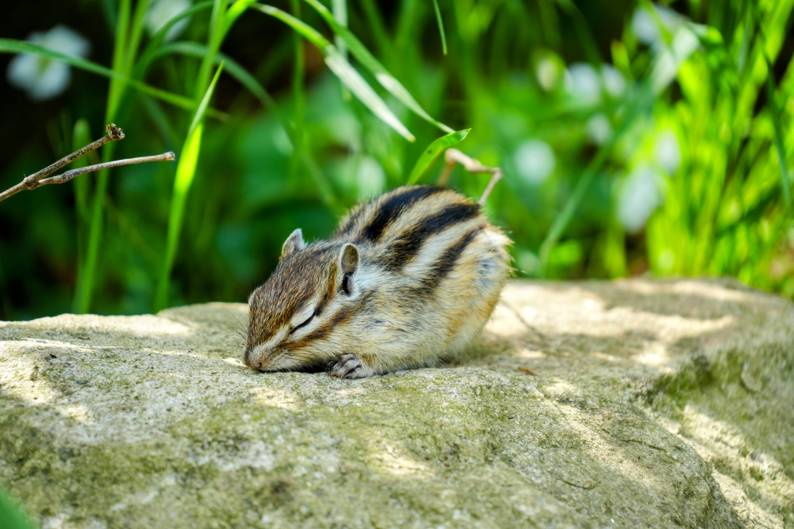 春のリス園の石の上でポカポカ陽気の下でまどろんでいるリスを撮りました。