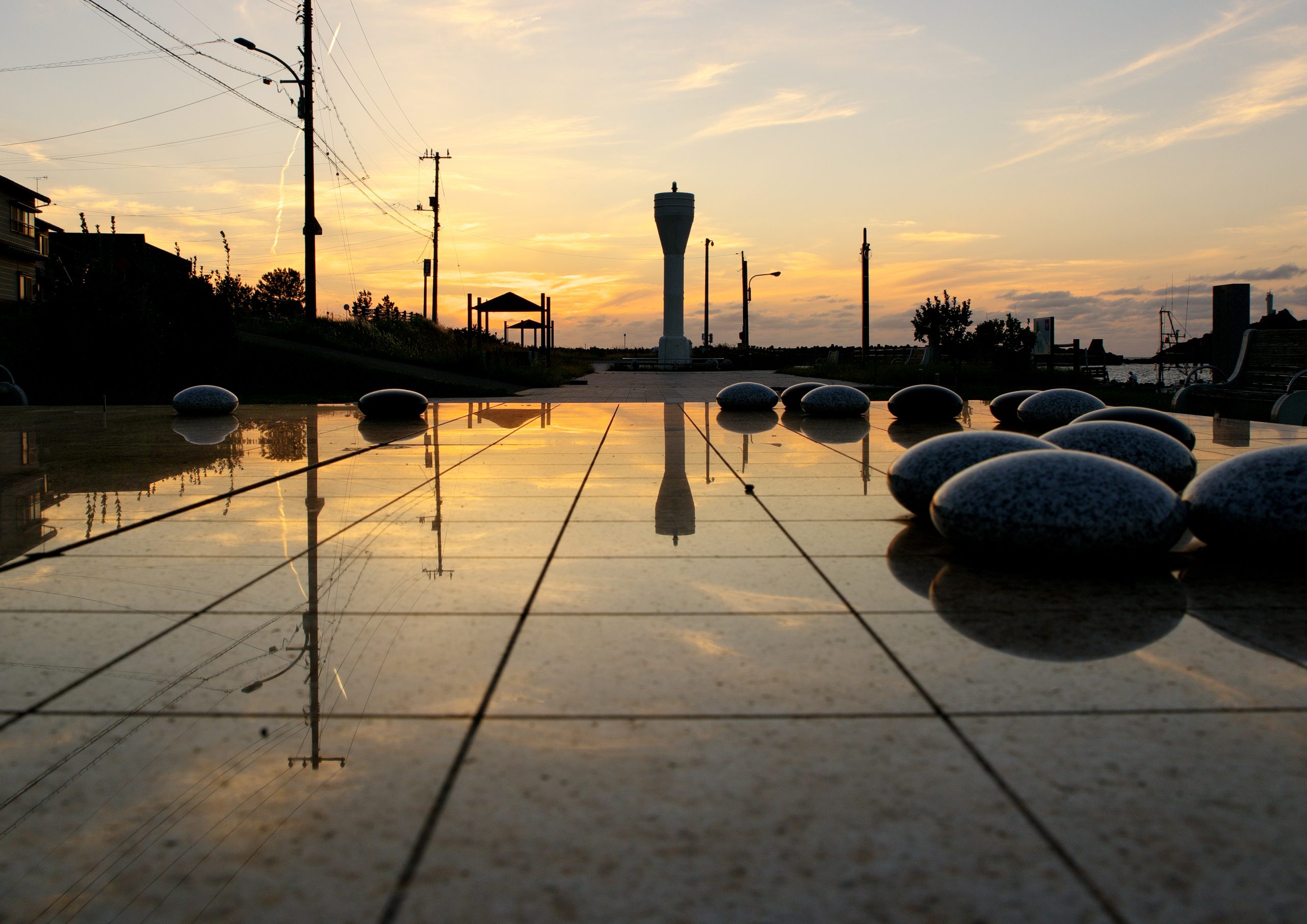 夕陽が碁石と近くの風景を碁盤に映し込んで、とても美しく珍しい光景に出会えました。