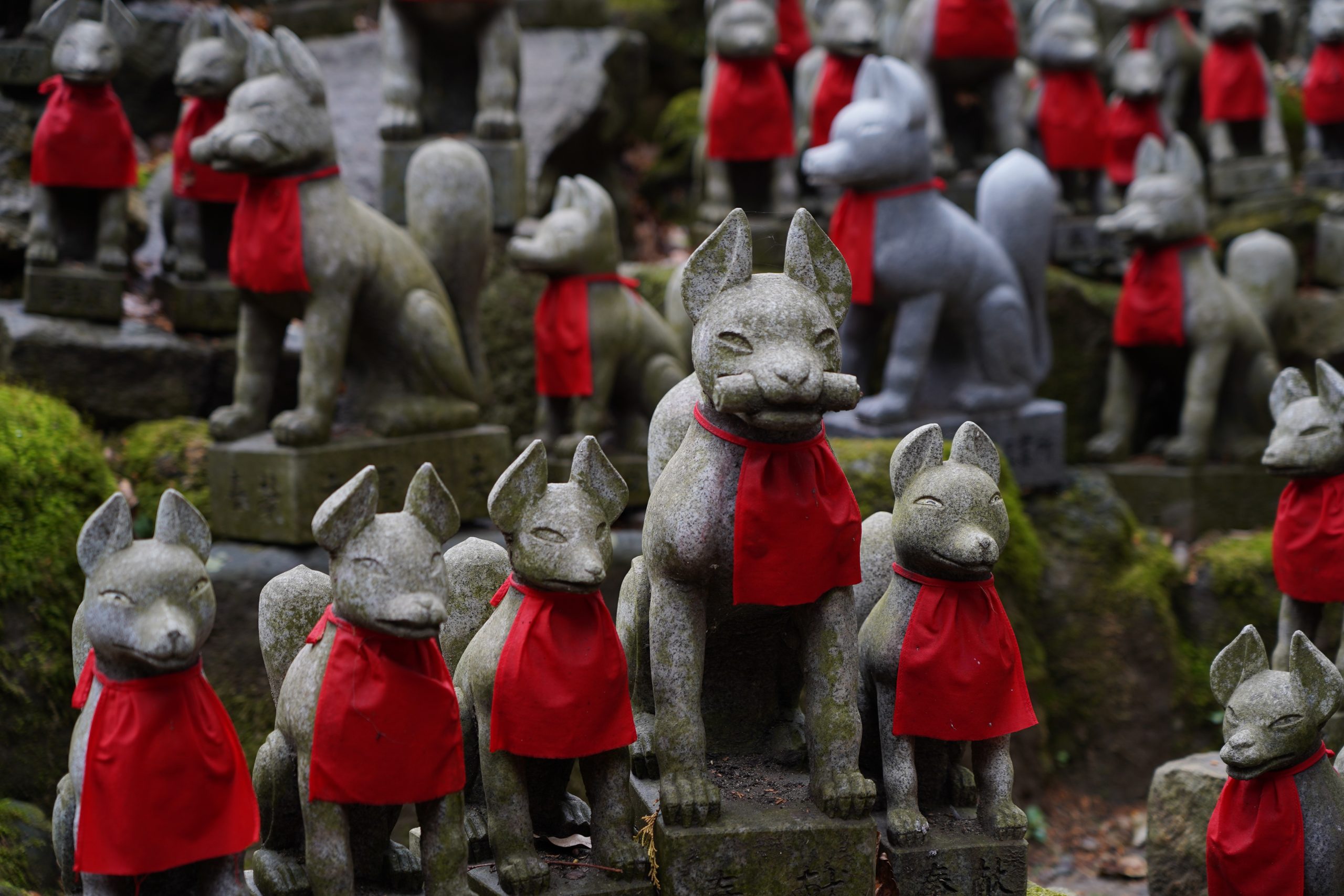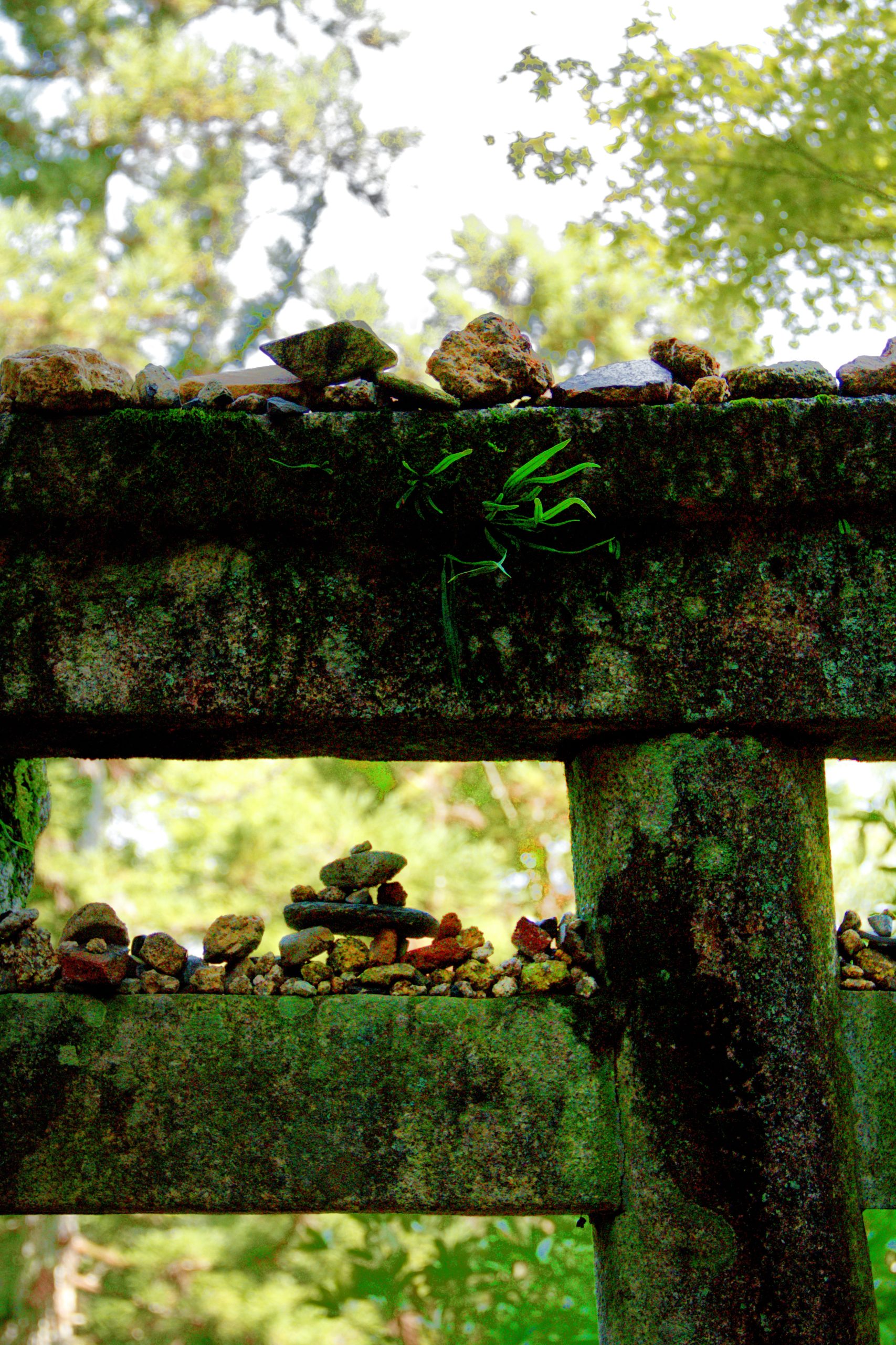 散歩道にあった鳥居。よく見ると、小さな石が積まれていた。