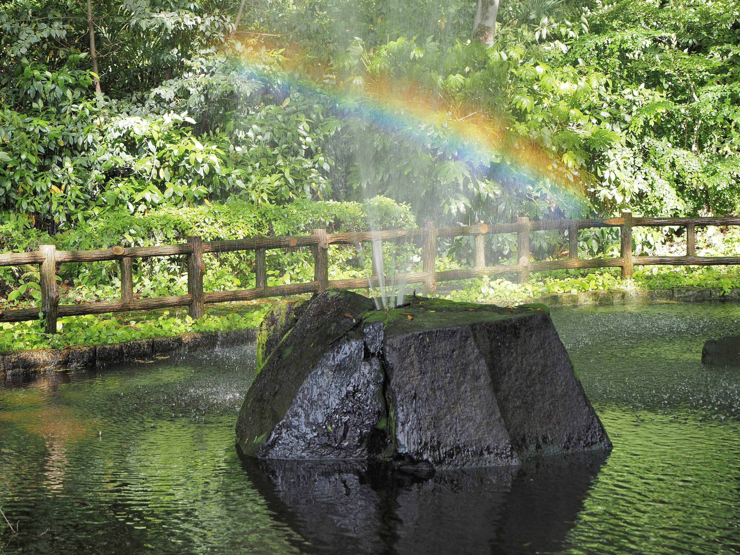 地元にある市民の森の公園にて。池には石が配された噴水がありますが、条件が整えばご覧の通りきれいな虹が見られます。