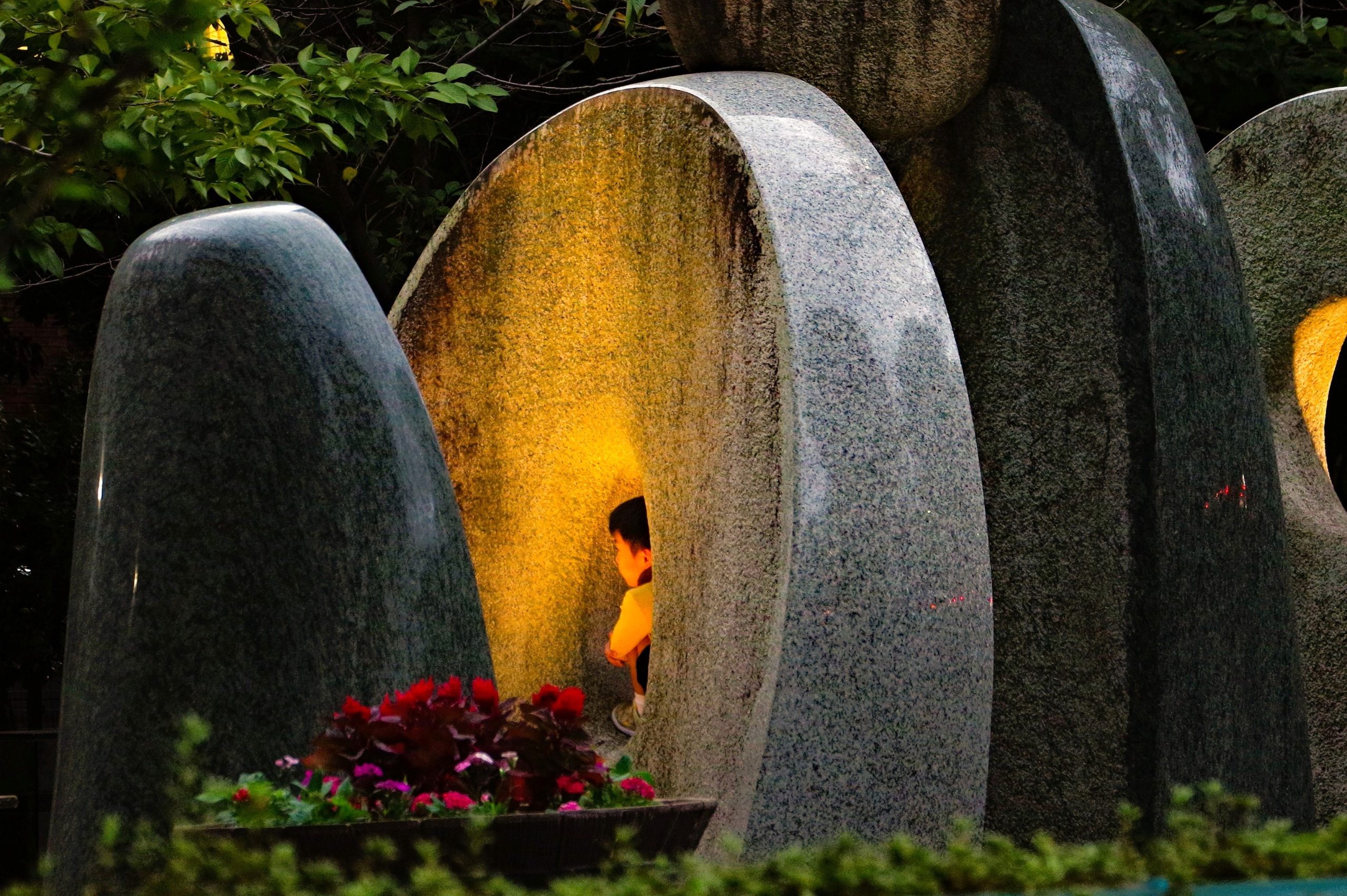東京都内を車で移動中に見た光景、石でできたモニュメントのある公園で小学生が夕闇迫る中でかくれんぼを楽しんでいました。