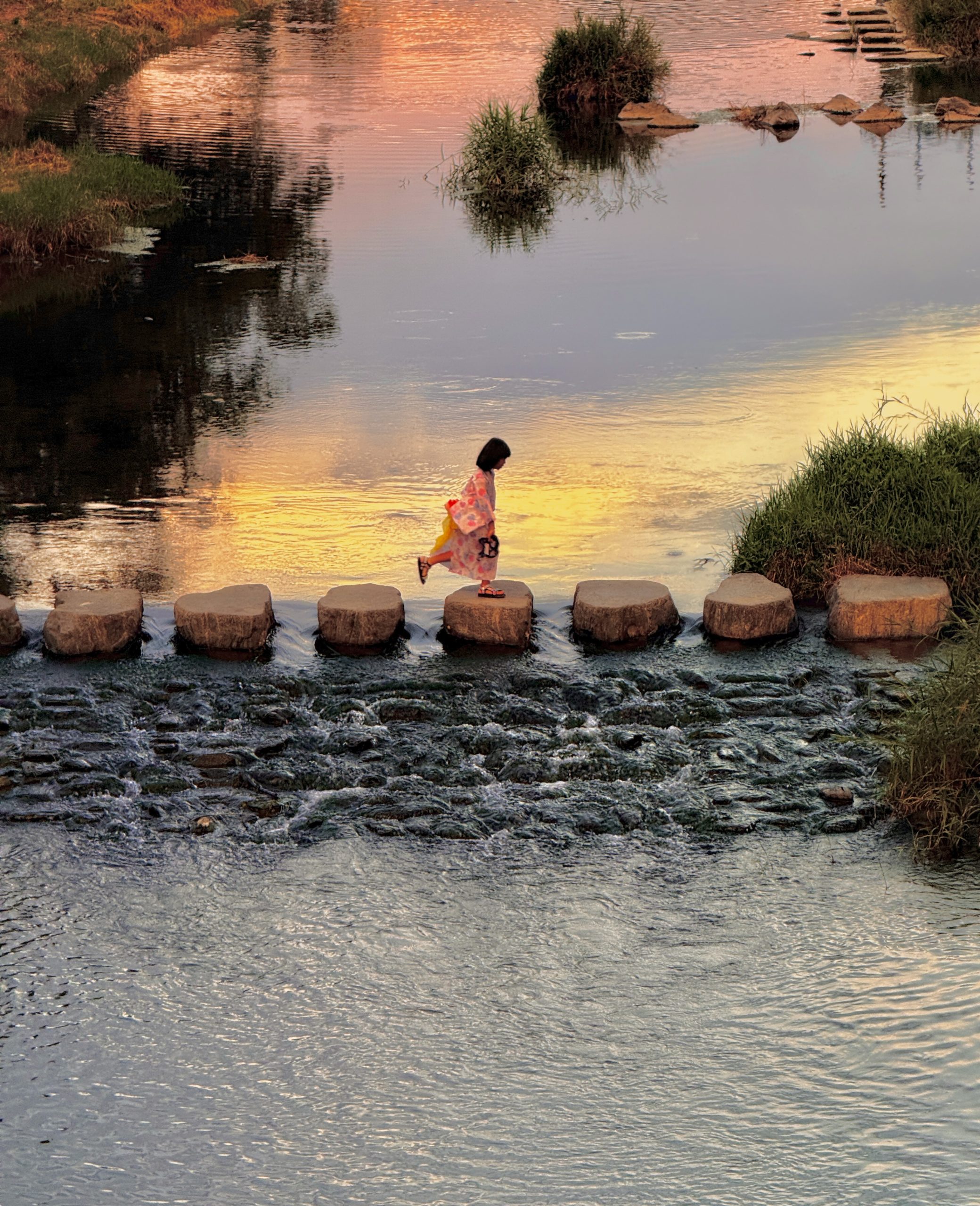 七夕まつりに行き花火も上がるので花火が見える川の所へ行ってみると浴衣を着た女の子が石渡りを颯爽と何度も行ったり来たりして渡っていたので撮らせていただきました。